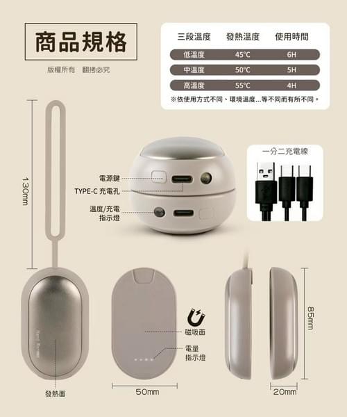 包裝內含:暖手寶(1組) x1、一分二充電線 x1、説明書 x1