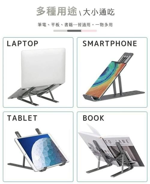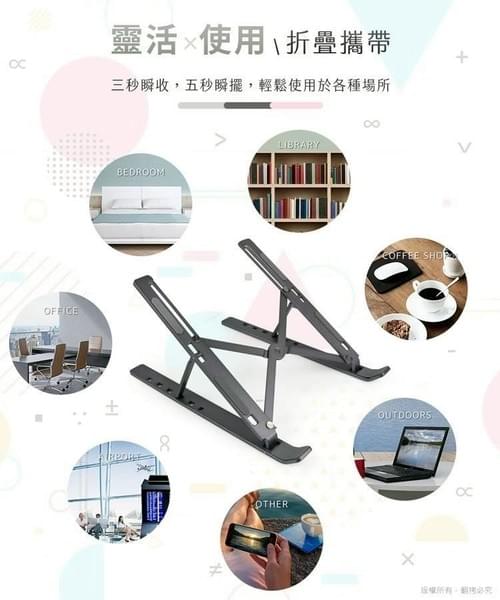 創新概念多功能支架,支援筆電、平板、手機等市面上主流設備,堅固耐用鋁合金材質,折疊式容易收納,展開即用。