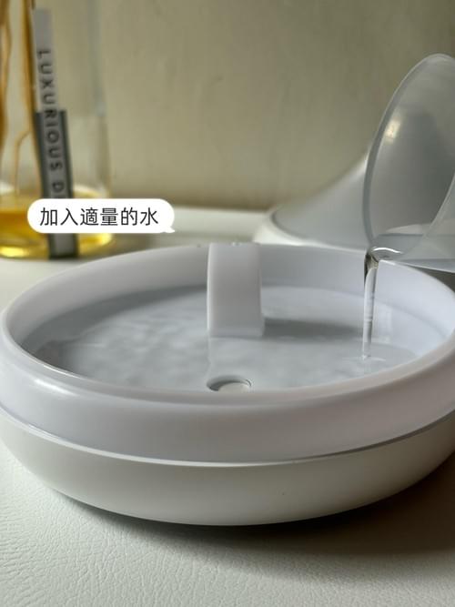 2.裝水後請將主體放置於平坦桌面,可加入2-3滴水溶性精油,再將上蓋裝回。切勿將機體傾斜放置以免水滲入主機內部分,導致故障發生