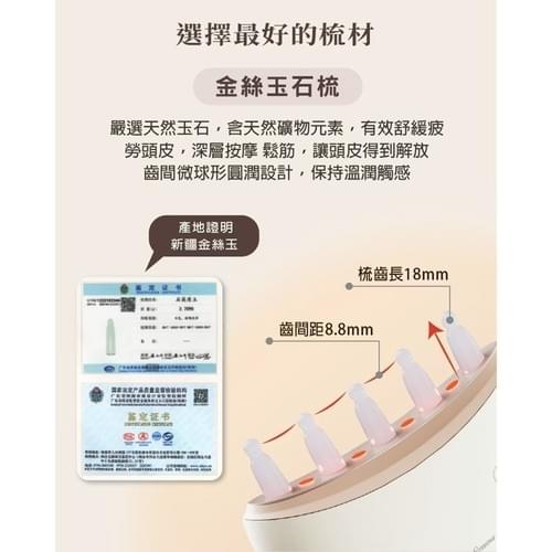 ✅ 金絲玉材質梳齒:寶玉石般材質,富含微量元素,有助減少靜電、撫平毛躁、更耐熱安全